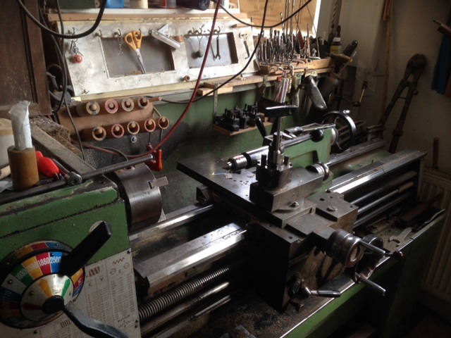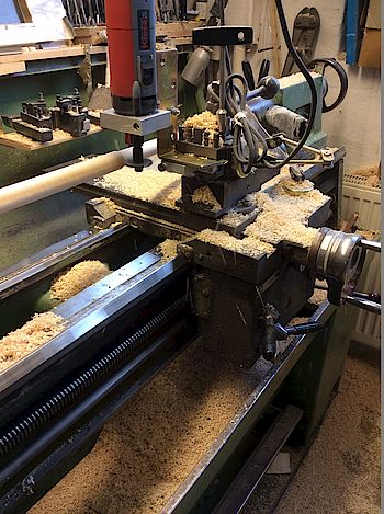 Hier wird ein Oberteilrohling in Vierkantform in einem ersten Arbeitsschritt rundgefräst. In vielen Schritten entsteht mit Bearbeitungspausen, von min. 10 bis 14 Tagen ein Custom - Oberteil mit Ausstattungsmerkmalen die der Kunde bestimmt: Länge, Gewicht, Material von Ferrule und Zierring, Abmessungen und Spieleigenschaften (LD-Eigenschaften...)